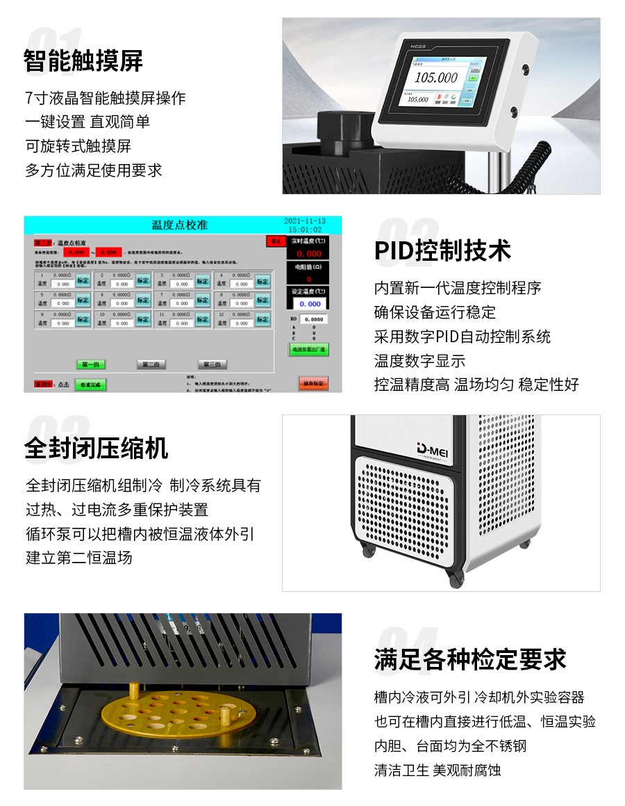 DY-RTS05制冷恒溫槽(0℃~95℃)是高精度自控式溫度檢定設(shè)備,控溫精度高,溫場均勻,穩(wěn)定性好,操作方便,采用全封閉壓縮機(jī)制冷系統(tǒng),外殼和內(nèi)膽都采用全不銹鋼材料制造,產(chǎn)品供計(jì)量部門作一、二等標(biāo)準(zhǔn)水銀溫度計(jì),貝克曼溫度計(jì)。工業(yè)鉑熱電阻,標(biāo)準(zhǔn)銅-康銅熱電偶檢定之用,也可作高精度熱、冷源供生產(chǎn)、科研使用。制冷恒溫槽是一種高精度自控式數(shù)顯溫度檢定裝置,它具有溫度穩(wěn)定性好,溫場均勻,控溫精度高等特點(diǎn)。制冷系統(tǒng)采用全封閉制冷機(jī),具有噪音低、可靠性好、壽命長。數(shù)顯溫控儀按PID調(diào)節(jié)規(guī)律實(shí)現(xiàn)溫度自動控制,結(jié)構(gòu)緊湊、操作方便、槽溫讀數(shù)直觀。適用于各計(jì)量、生化、石油、氣象、能源、環(huán)保、醫(yī)藥等部門及生產(chǎn)溫度計(jì)、控溫器等廠家進(jìn)行物理參數(shù)的檢測,并可為其他實(shí)驗(yàn)研究工作提供恒溫源。
