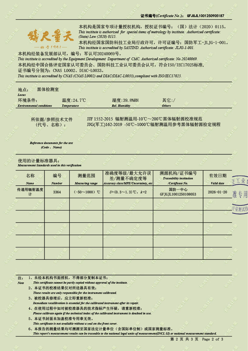 上一條:黑體輻射源(50-500℃)校準證書(shū) | 下一條:超低溫面源黑體爐(-40-80℃)校準證書(shū) |