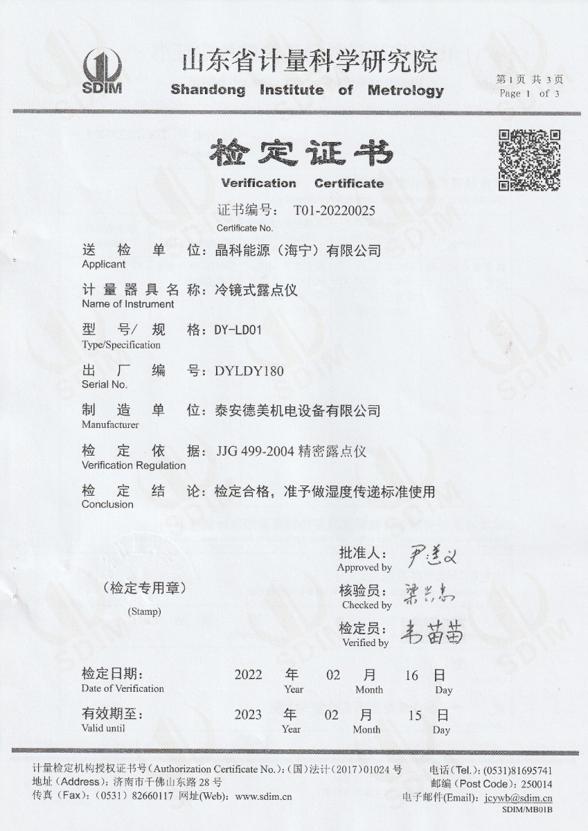 上一條:晶科能源(海寧)有限公司-冷鏡式露點(diǎn)儀(溫度)校準證書(shū) | 下一條:便攜式干體爐(-30-150℃)校準證書(shū) |