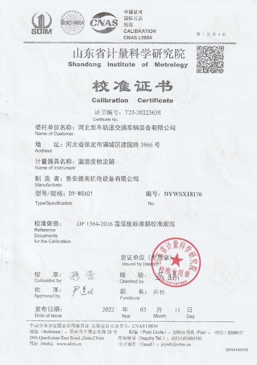 上一條:河北京車(chē)軌道交通車(chē)輛裝備有限公司-低電勢掃描開(kāi)關(guān) | 下一條:超低溫面源黑體爐(-40-80℃)校準證書(shū) |
