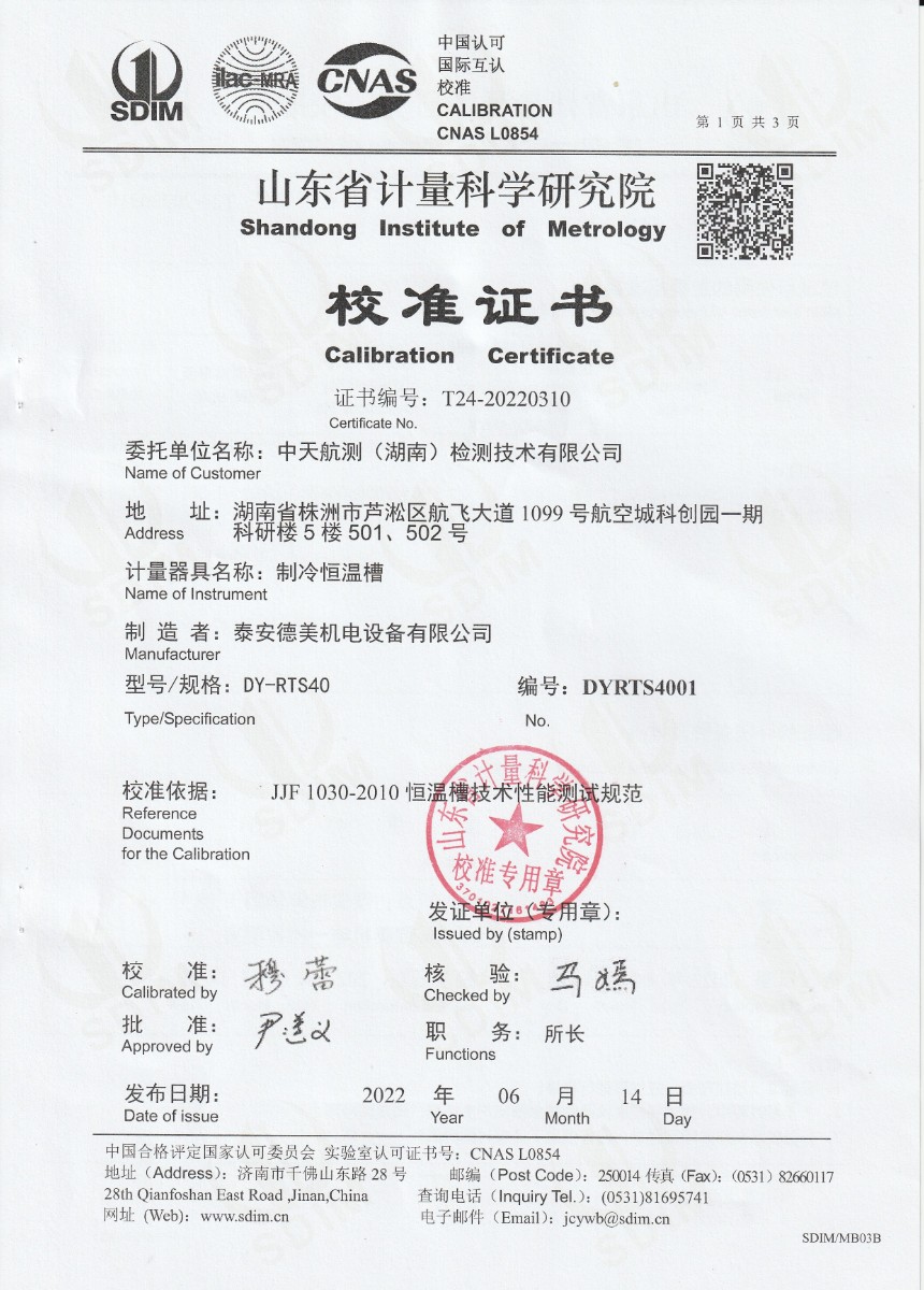 | 上一條:中天航測(湖南)檢測技術(shù)有限公司-恒溫油槽 | 下一條:超低溫面源黑體爐(-40-80℃)校準證書(shū) |