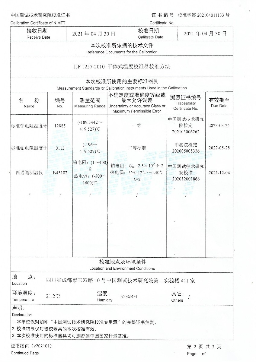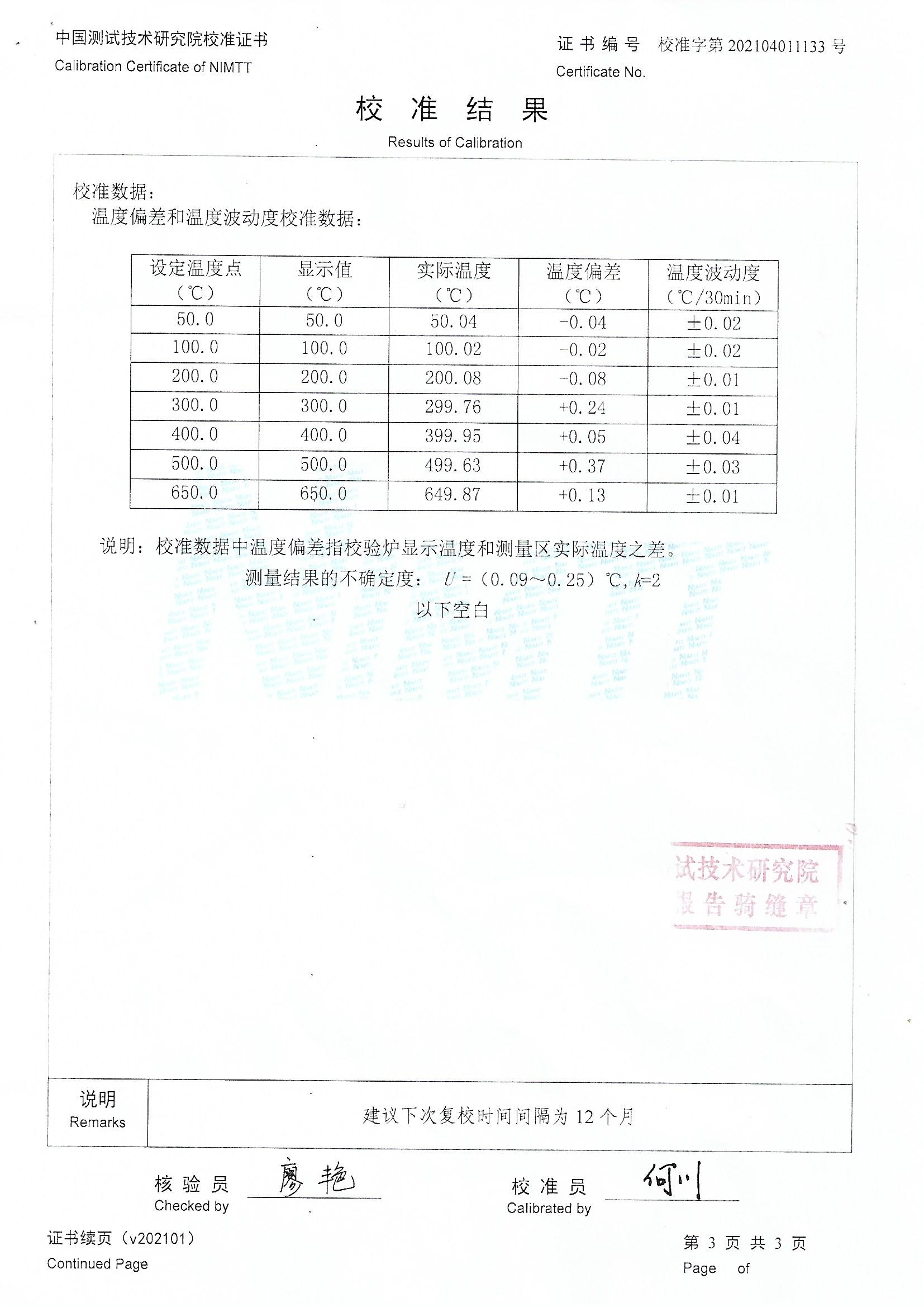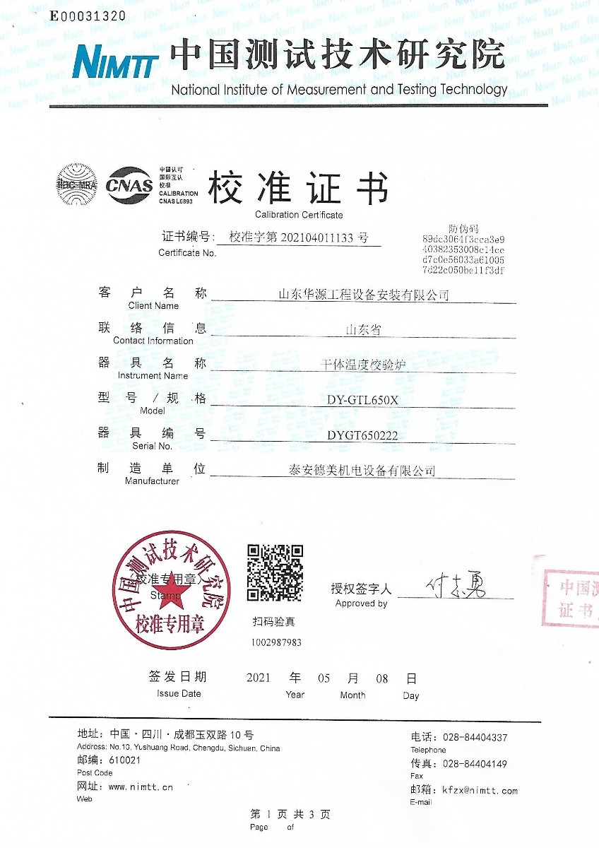 | 上一條:馬鞍山科思化學(xué)有限公司-干體溫度校驗爐 | 下一條:超低溫面源黑體爐(-40-80℃)校準證書(shū) |