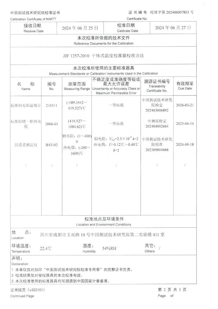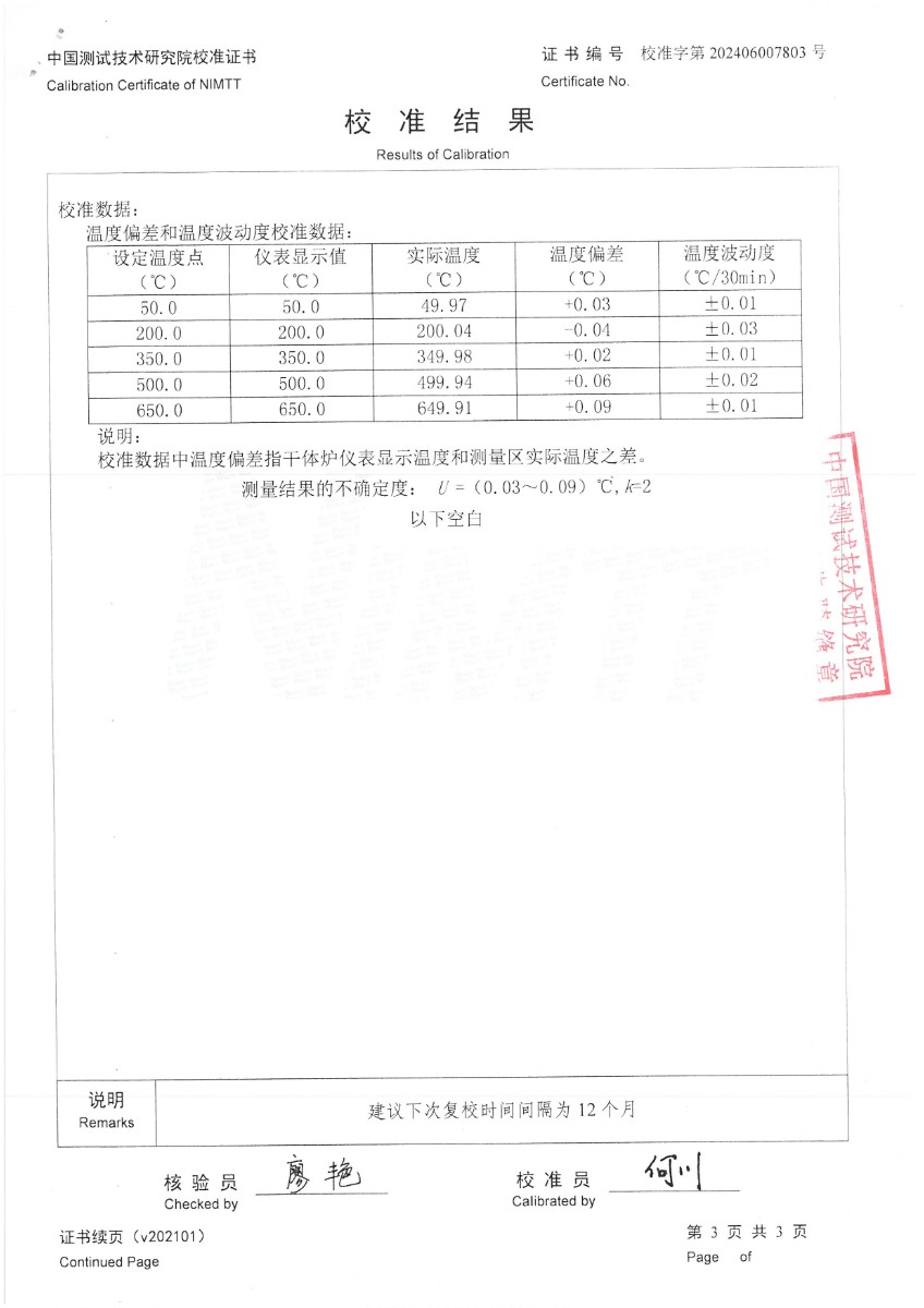 中溫干體爐(50~650℃)校準證書(shū) 2024-7-1 本文被閱讀 5982 次